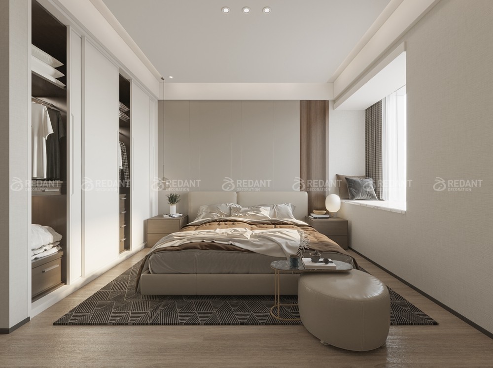 自然哑光与手工质感的暖灰色系床品,与温润的木饰面搭配。在光的作用下,材质本身的质感便足矣传达出空间温和而舒缓的气质。