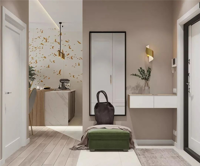 设计了四式分离柜,门厅稍会显得拥挤,要懂得巧妙利用镜子,如果空间不够,可以将四分式门厅柜的挂衣处改为镜子,不仅可以缓解空间的拘束感,也可以在出门时整理仪容仪表。