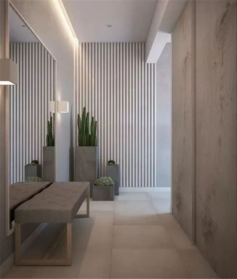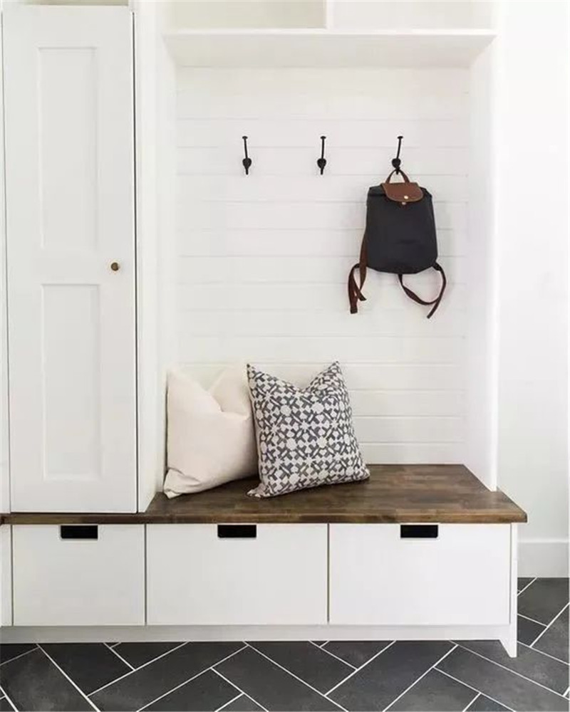 门厅柜设计可以在四分离的基础上保留置物台、挂衣处、换鞋格,而换鞋凳则可以安置在柜子的延伸处,或者与柜子分离开来,这样可以更好的提升门厅空间的使用率。