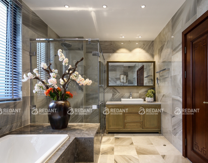 洗手间墙地面选用了水墨色系仿大理石瓷砖,彰显着尊贵与典雅,恰到好处的中式点缀使整体风格更加统一。