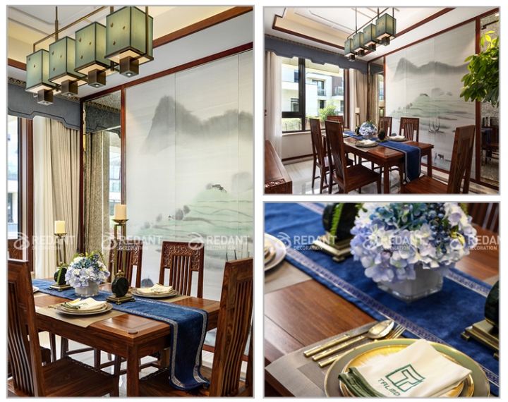 餐厅整体色彩,造型跟客厅遥相呼应,背景采用一副淡绿色彩的江南水墨画,绿色调穿插其中,一定程度上使空间增加了“灵动”,使整个空间更加有韵味和气质。