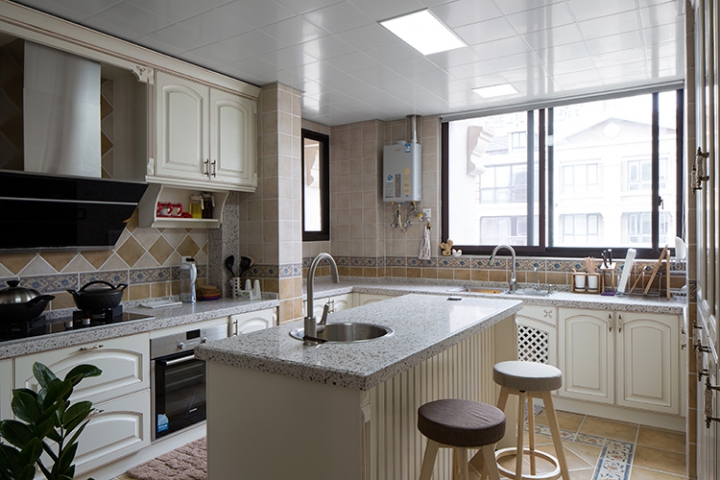 厨房也是做了一定的改造,原先厨房比较小,业主又比较注重厨房的功能性,所以将原始厨房外的北阳台与厨房打通,扩大,在中间设计一岛台,将厨房的各个功能点都配到位,满足了客户的实际需求,以白色仿古做旧门板,配以深浅搭配的仿古砖加上花片砖做腰线和地面走边,复古中流露着自然。