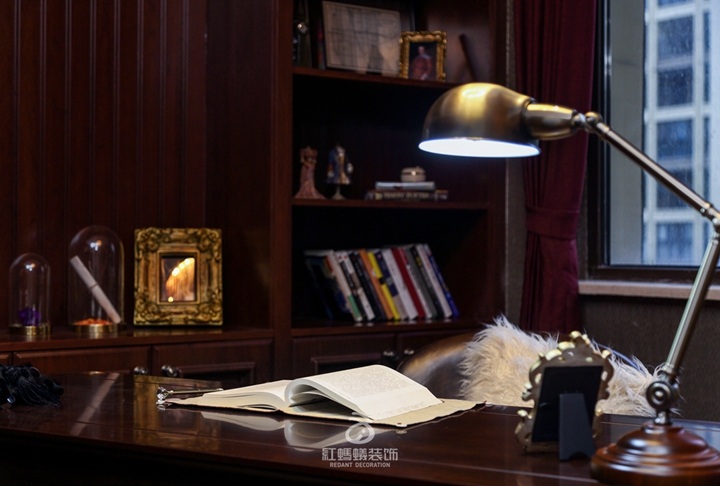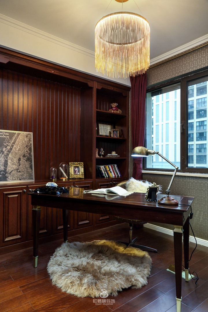 书房相较于其他空间在颜色的运用上则更加沉稳,给人一种文化经久积淀的感觉,金属桌角的选择以及流苏形吊灯的搭配则给整体空间带来了更多活泼感。