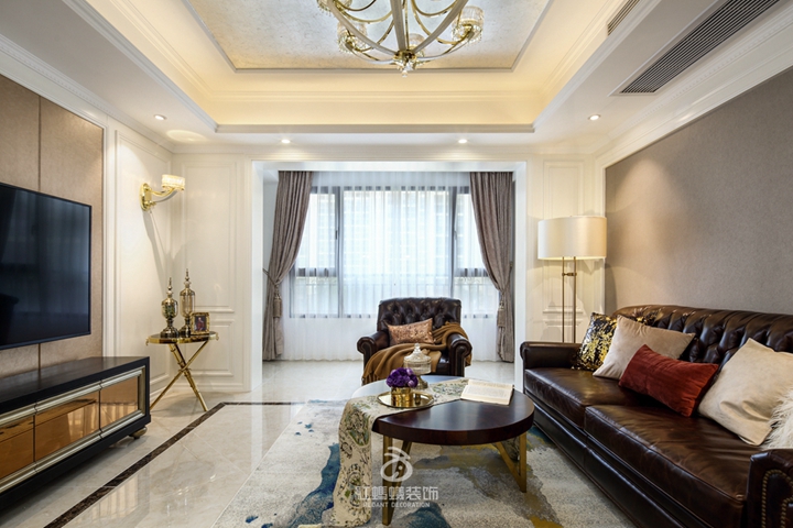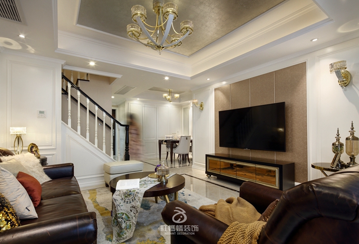 客厅以经典的白色系为主背景色,配上深褐色的沙发和茶几,并在细节处运用金属元素与电视背景的浅褐色相呼应,将美式轻奢的韵味巧妙的融入其中。