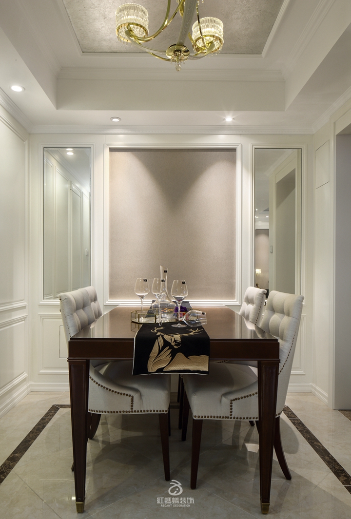 本案在结构上最大限度的做到动线合理,空间上也尽可能的通透宽敞,在满足日常功能需求的同时,寄予户主精神愉悦放松的空间。在古典美学规范下,采用现代先进的工艺技术和新材质,搭配应景色彩重新诠释美式轻奢的精神内涵,具有端庄,雅致,明显的时代特征。更多红蚂蚁装饰案例进入官网经典案例页面,多种风格案例供您参考。