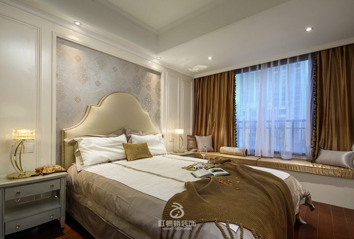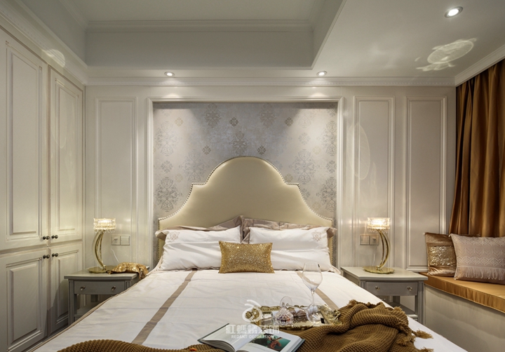 卧室整体以白、金为主色调,整面的衣柜完全满足了日常的收纳需求,同时飘窗的设计更是让刘女士更多了一个随处阅读的场所。