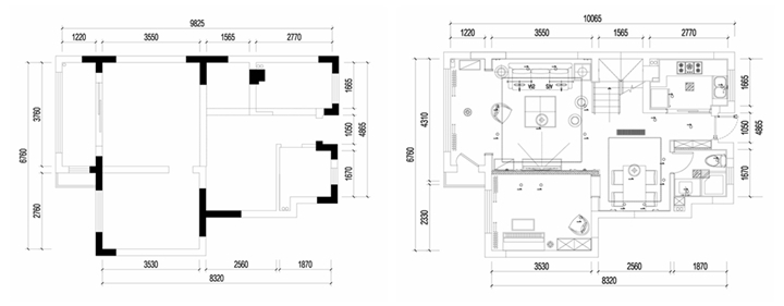 在与刘女士沟通的时候,她就表达了对套房的强烈喜爱,所以在空间规划上,为了做到尽可能的开放,将原来的四房改成三房,这样就可以满足客户所求,打造一个卧室+书房的舒适实用的套房格局。