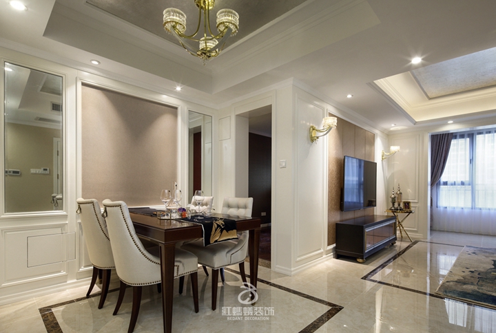 餐厅的空间在与客厅衔接的时候注重整体性的打造,墙纸、墙体造型以及地砖勾线在色彩与形状上都做到了相互辉映。