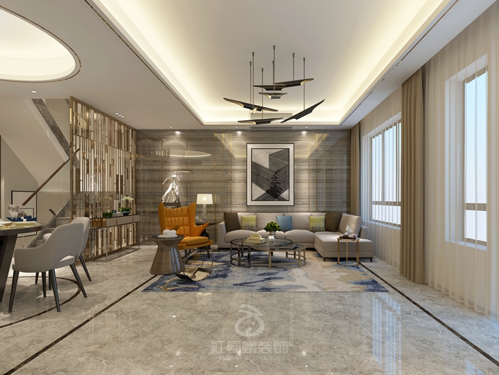 在本案中,在整体的设计中注重硬装修手法的简洁,主要通过吊顶和墙面的设计来体现整体的风格,在设计局部使用一些闪亮的元素,比如在客厅和餐厅中,吊顶的拉丝不锈钢与墙面的饰面相互呼应。不锈钢等元素的运用能表现装饰主义和古典主义的风潮,是奢华主义的重要表现手法。同时在墙面饰面上运用了木材。木材本身具有一种特有的温度,而这种温度能增強整個家居的温馨感。